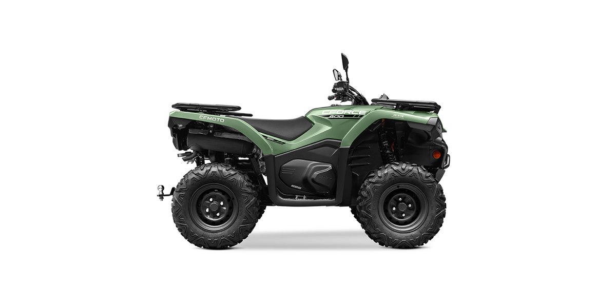 like less vibration, tighter turning circle and greater comfort. The CFORCE 400's work-ready attitude starts with the 31hp, 400cc, fuel-injected, four-stroke single-cylinder engine - perfect for the farm - with 2WD/4WD and a locking front differential. Other at-a-glance features: Hunter Green livery, 12-inch steel wheels, halogen headlights, 3.5-inch LCD dash, steel racks and 24-inch tyres.
